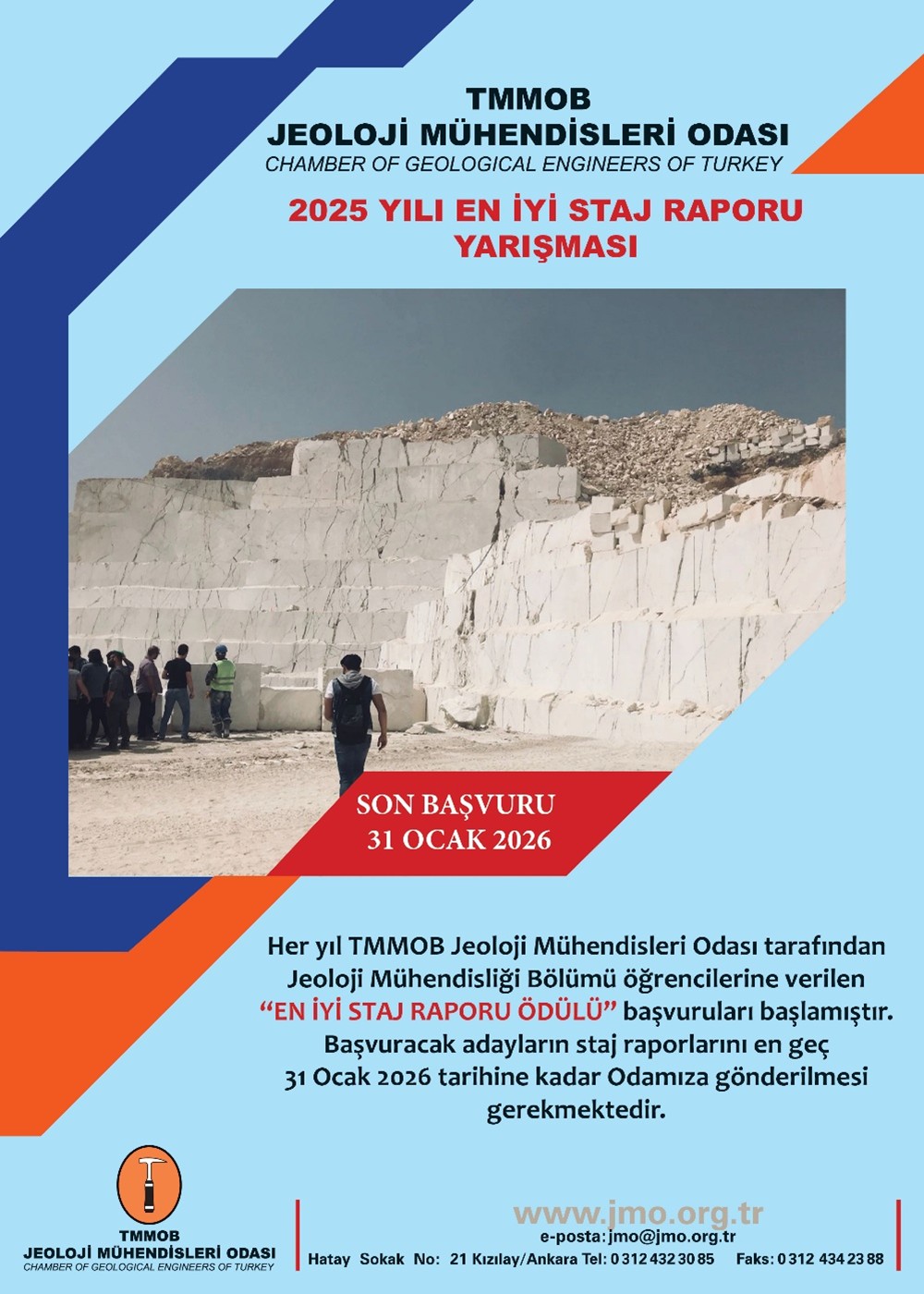 TMMOB Jeoloji Mühendisleri Odası tarafından düzenlenen 2024 Yılı En İyi Staj Raporu Yarışması’nda ödül alan Hidrojeoloji Mühendisliği Programı öğrencilerimizden Aslı Demirtaş ve Oğuz Kaan Özay’ı tebrik ediyor başarılarının devamını diliyoruz. 9 Nisan 2025 |